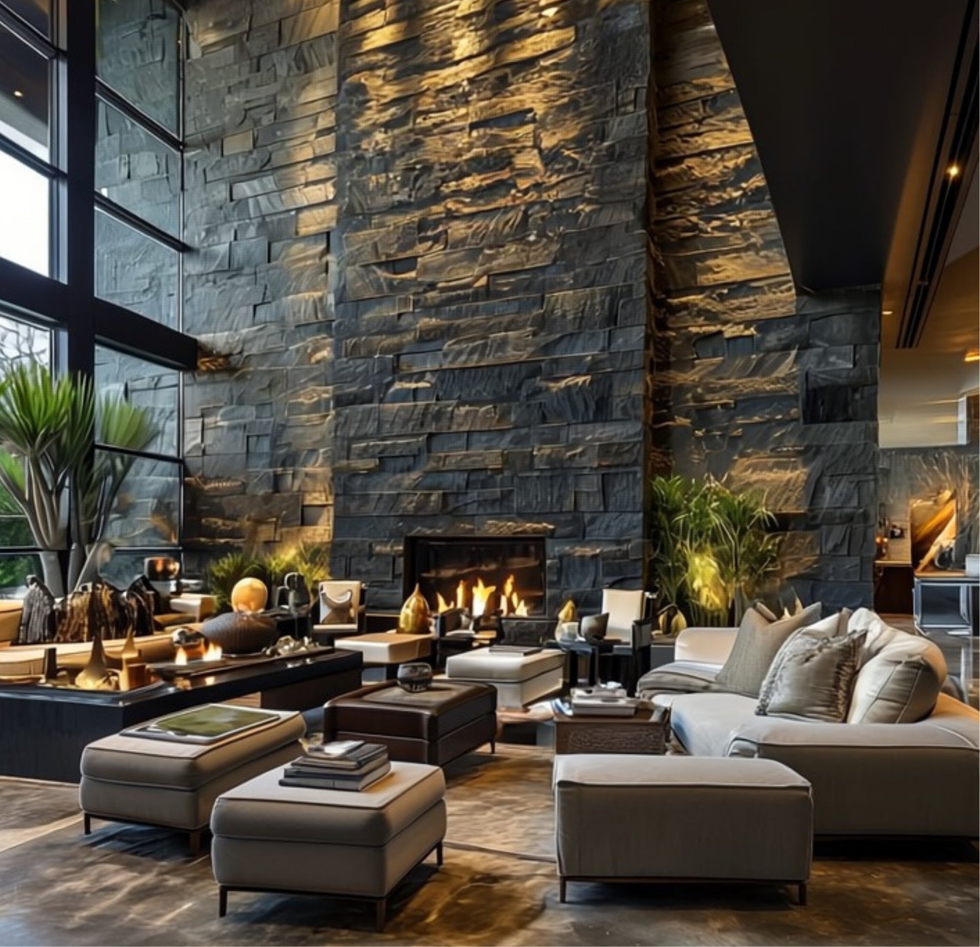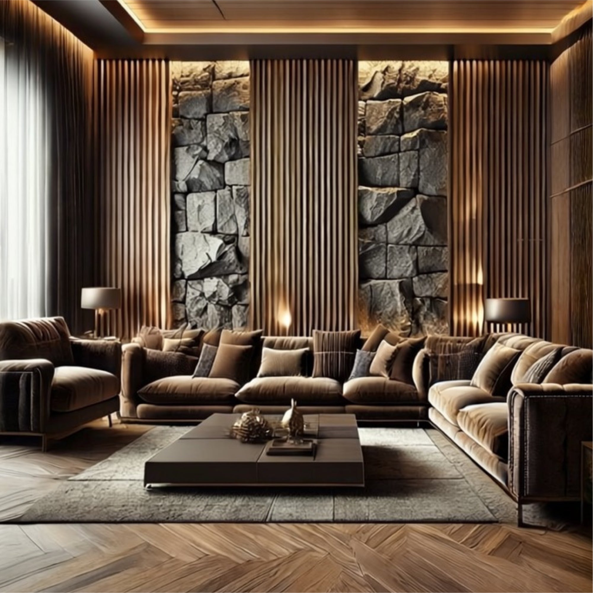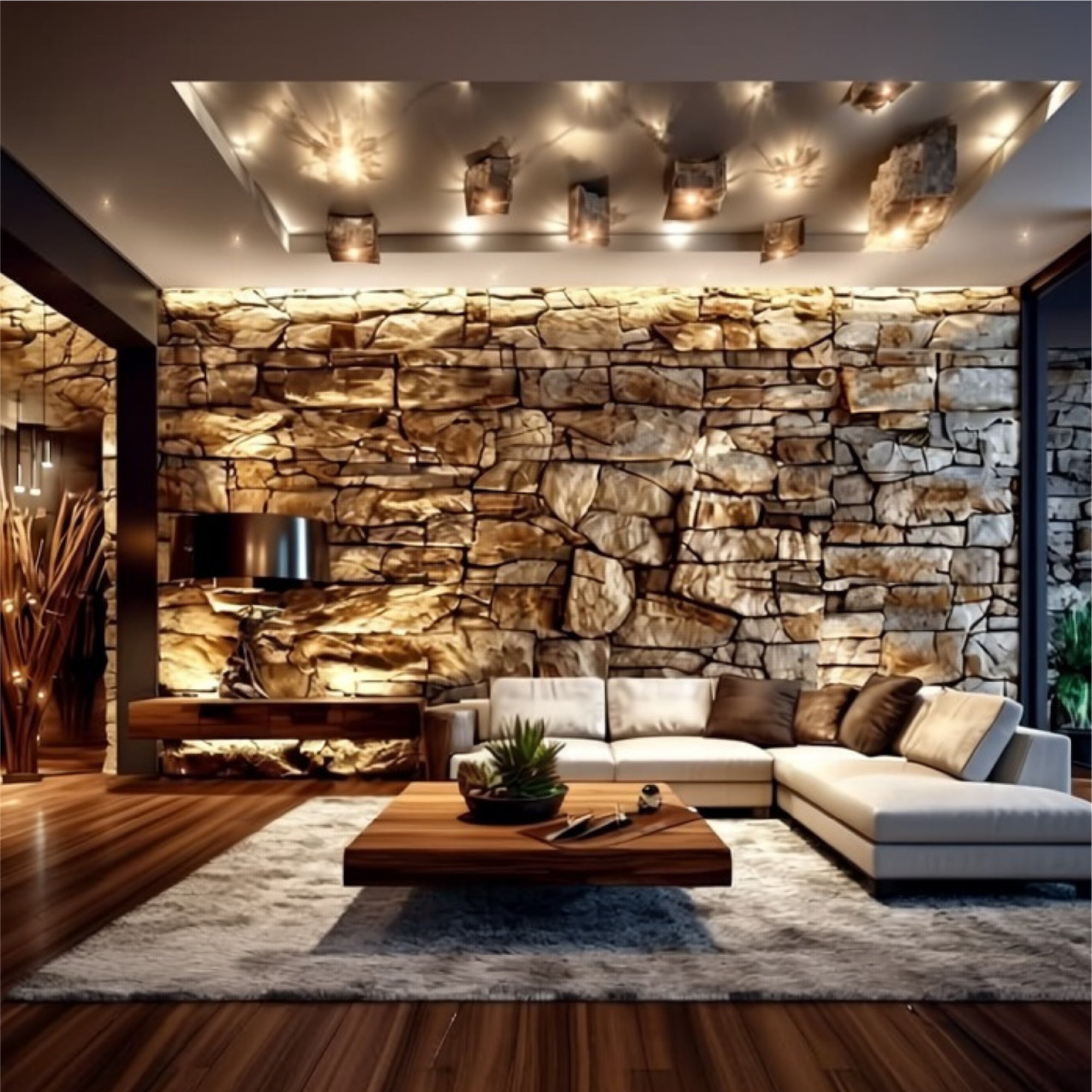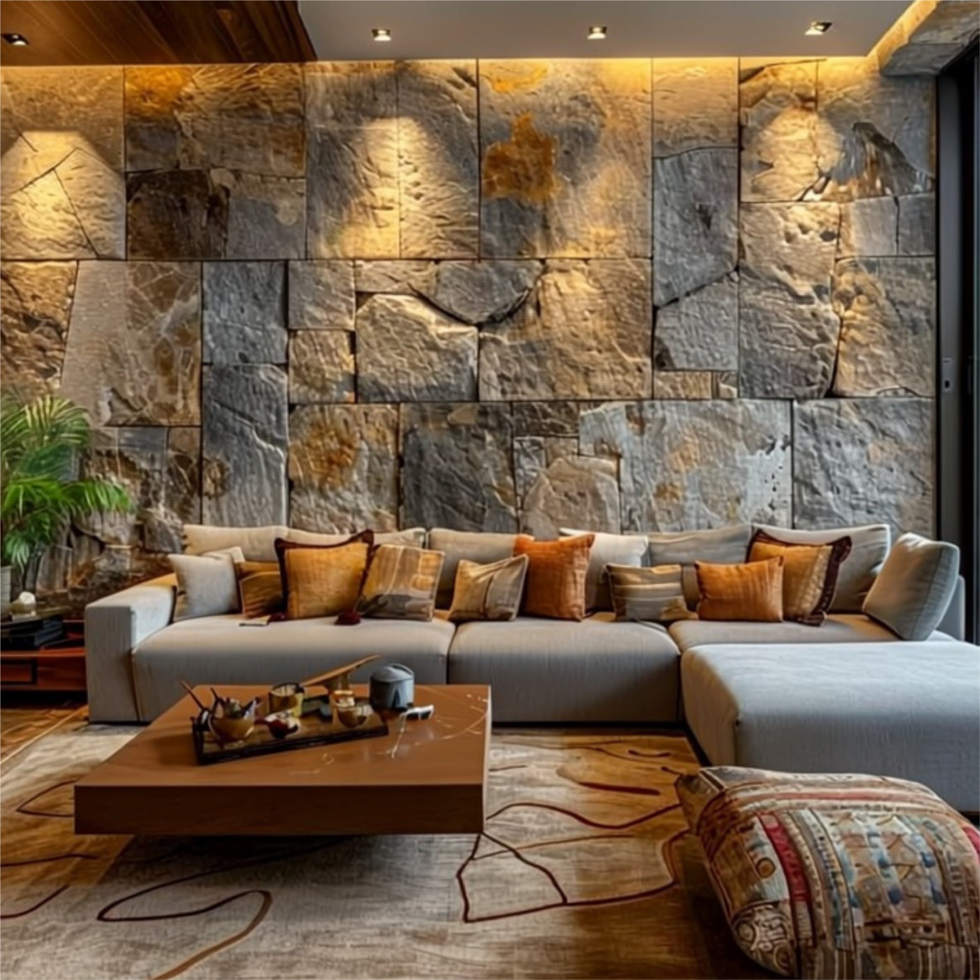 Decorative stone Modern living room with a natural stone accent wall.Warm tones and clean textures.wall finishes.