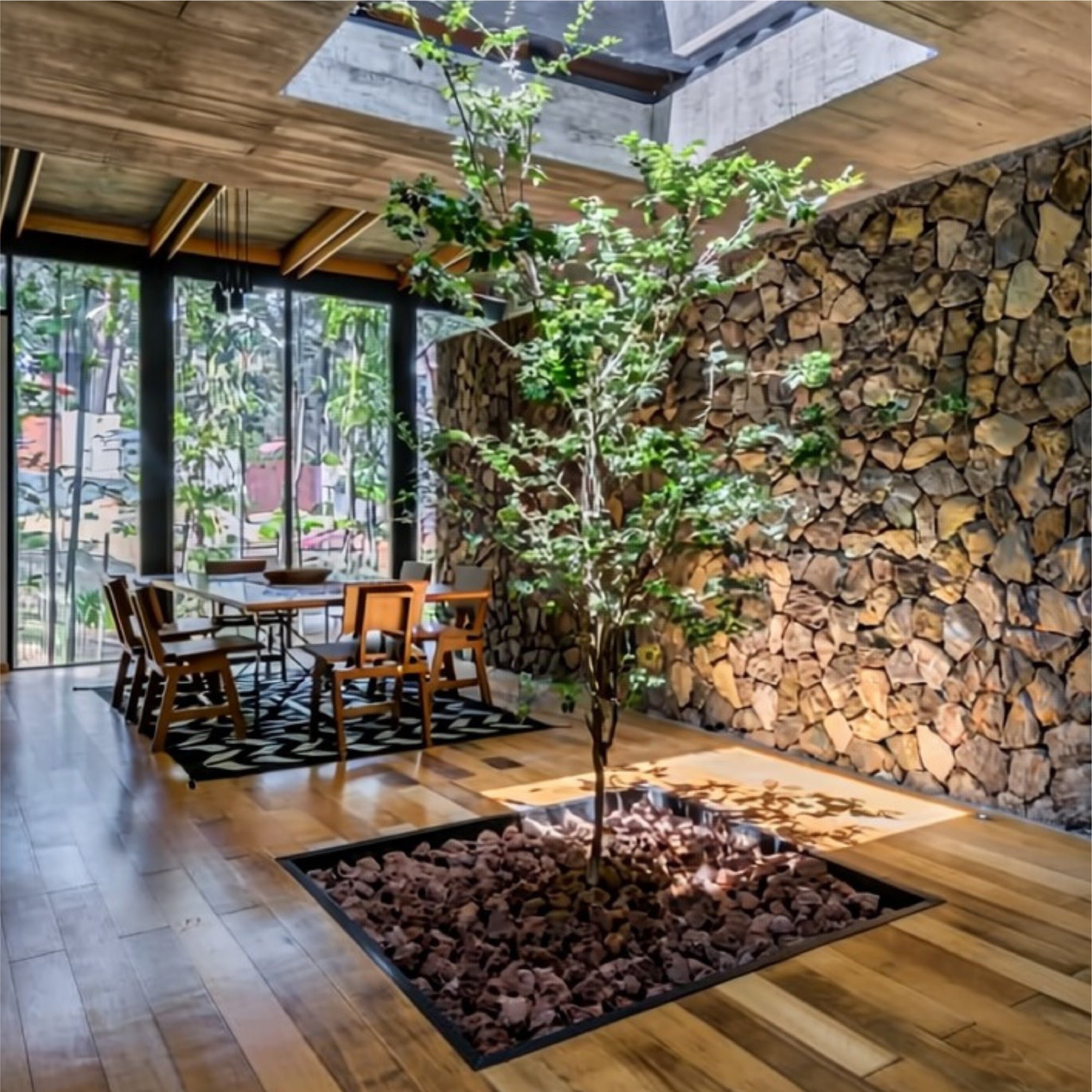 Decorative stone finishes that enhance interior warmth. Sophisticated and timeless style.